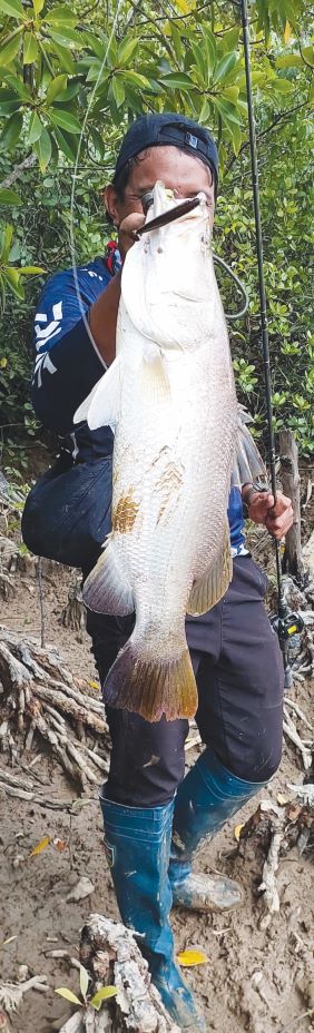 Saya mendapat strike pertama siakap putih anggaran berat 800 gram (g). Setelah bergambar kami meneruskan aktiviti. Selang beberapa minit umpan Akim mengena seekor siakap putih, bila sampai di tebing, ikan tersebut lucut. Tidak berputus asa dia mencuba lagi dan berjaya mendaratkan rakan ikan yang terlepas tadi.