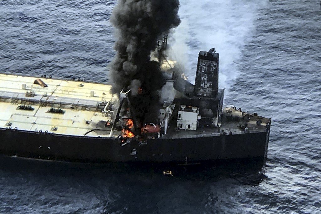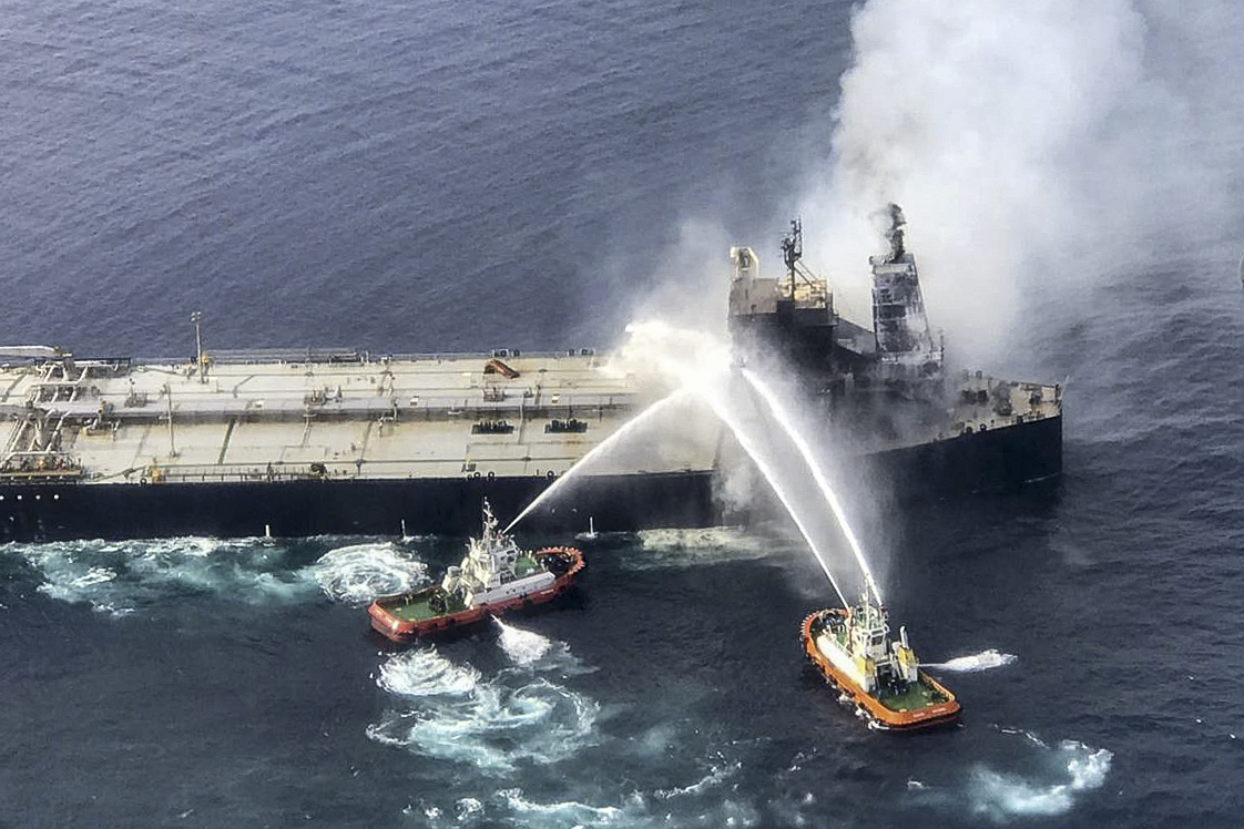 “Tidak ada tumpahan minyak dilaporkan,” menurut Pengawal Pantai India selepas satu kerjasama kedua-dua negara itu untuk mengekang kebakaran di atas kapal tersebut.