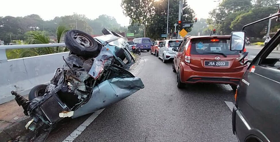 Keadaan kereta Proton Iswara yang terbalik dalam nahas membabitkan empat buah kenderaaan di lampu isyarat simpang empat Jalan Bukit Baru-Duyung, Melaka pagi tadi.