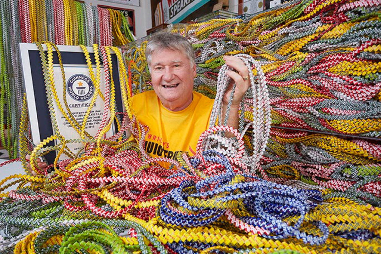 VIRGINIA, Amerika Syarikat – Seorang pesara mengambil masa selama 55 tahun untuk menganyam kertas pembalut gula-gula getah bagi membentuk rantai terpanjang dunia, lapor The New York Post.
