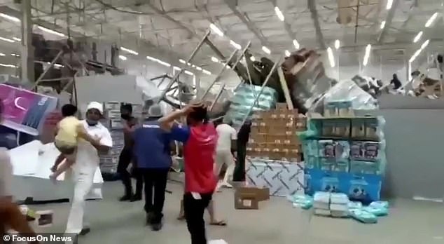 Orang ramai melarikan diri sebalik melihat runtuhan berlaku kemudian bergegas kembali untuk mencari mana-mana mangsa di bawah timbunan barangan dan rak.