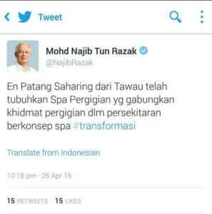 Idea klinik spa yang diusahakan Patang turut mendapat perhatian bekas Perdana Menteri, Datuk Seri Najib Tun Razak yang meninggalkan ciapan di laman Twitter yang memuji usaha inovasi Patang itu.