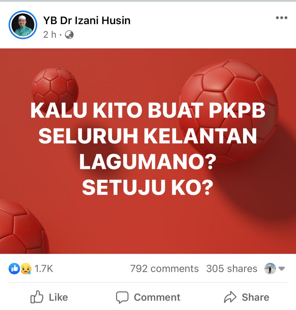 “Kalu kito buat PKPB seluruh Kelantan lagu mano? Setuju ko? (Kalau kita laksanakan PKPB seluruh Kelantan macam mana? Setuju ke?),” katanya Izani.