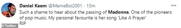 Kekeliruan itu menyebabkan nama Madonna pula trending di Twitter sejak pagi tadi.