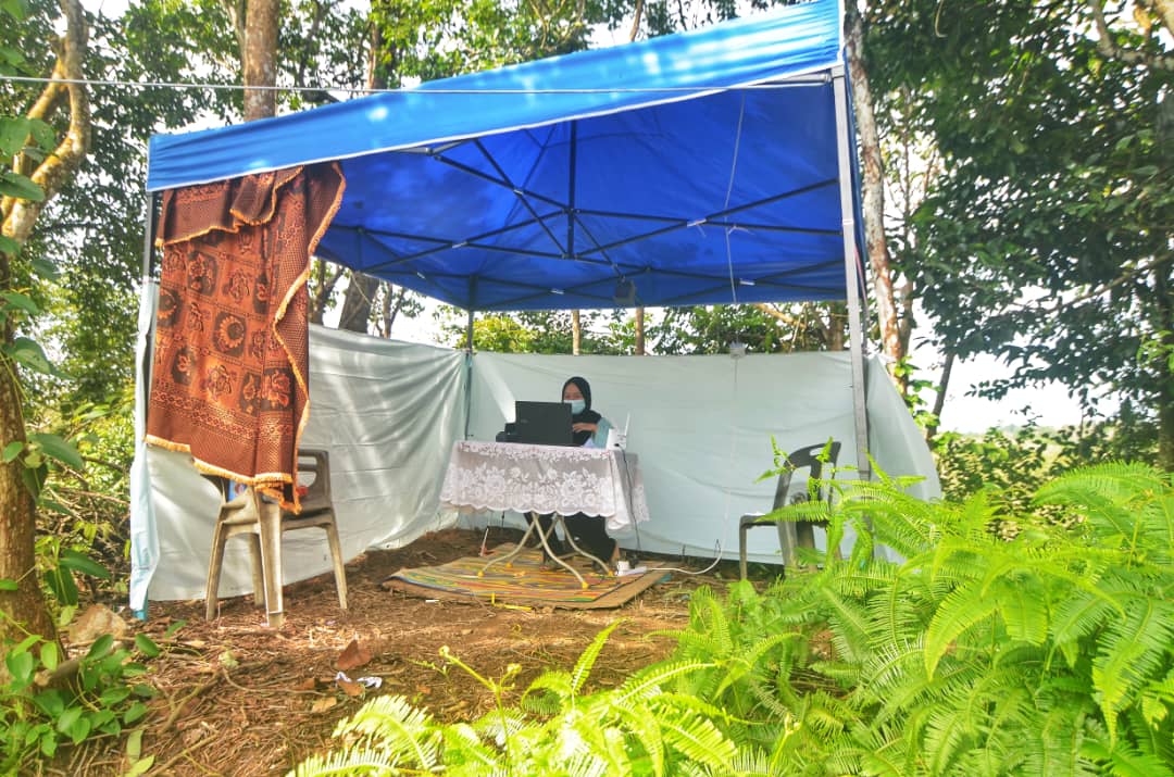 Nurlieda Khaleeda duduk di bawah kanopi yang dipasang bapanya di atas bukit belakang rumah untuk menjalani ujian dan pembelajaran secara dalam talian.