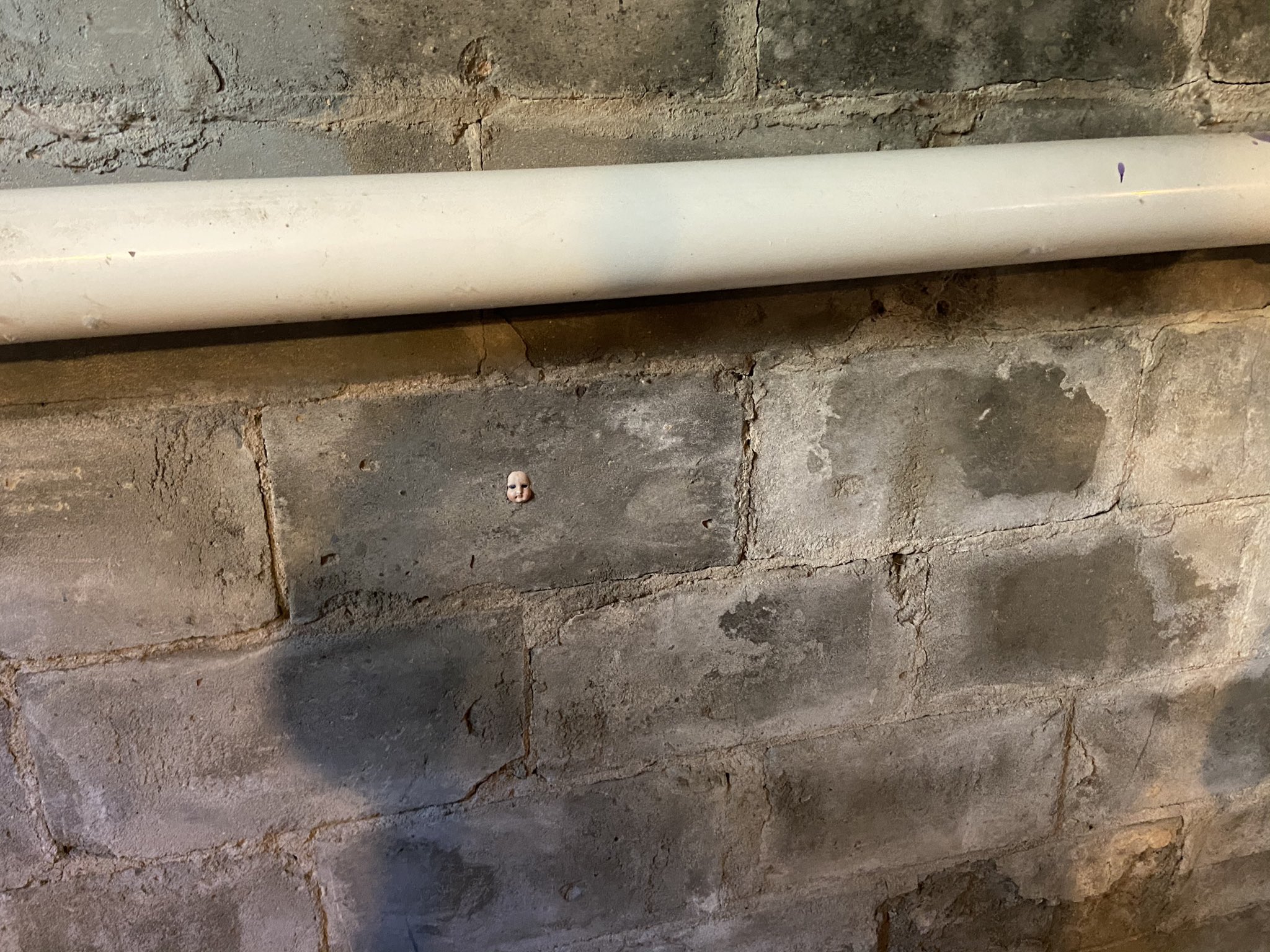 Sekeping gambar yang dimuat naik di media sosial menunjukkan kepala anak patung bersaiz kecil itu kelihatan seperti tertanam di dalam salah satu blok konkrit di ruang bawah tanah.