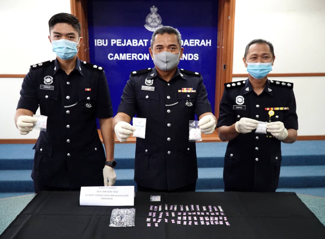 “Suspek yang berasal dari Slim River, Perak itu ditahan di rumah sewanya di Ringlet dalam serbuan pukul 12.30 tengah hari oleh sepasukan anggota dan pegawai Bahagian Siasatan Jenayah Narkotik, Ibu Pejabat Polis Daerah (IPD) Cameron Highlands hasil maklumat daripada orang awam.