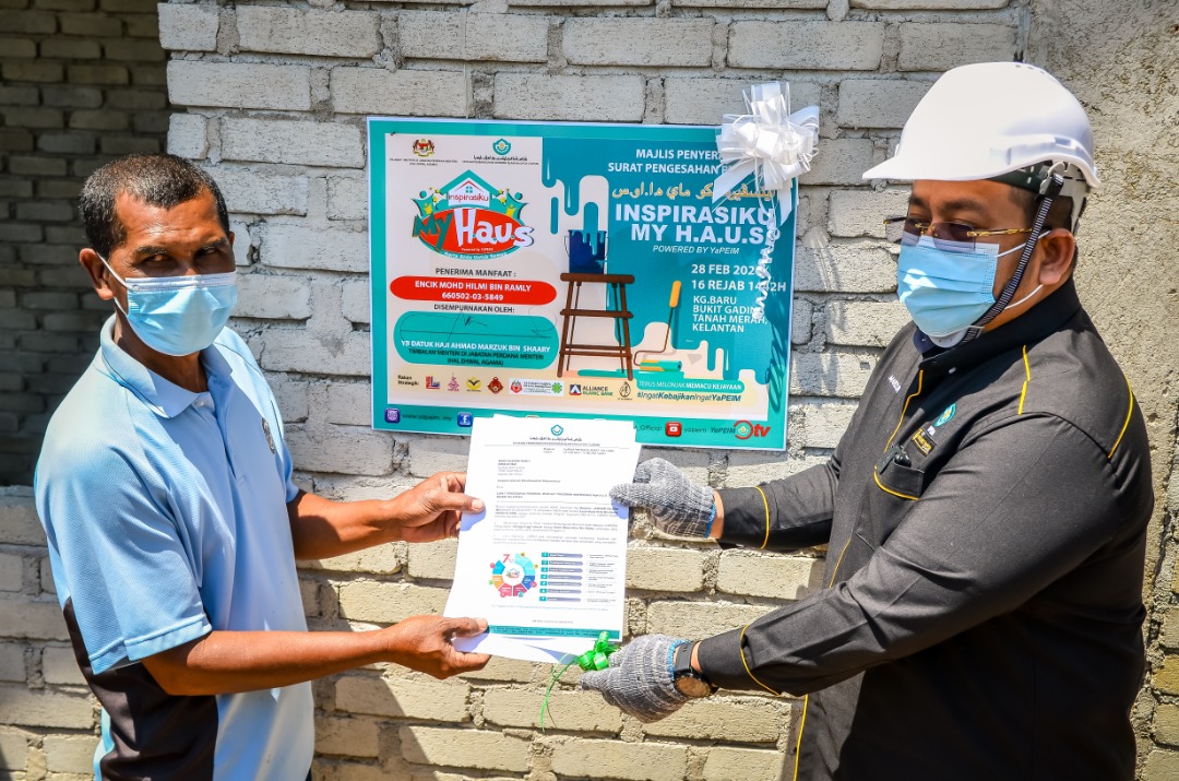 AHMAD Marzuk (kanan) menyampaikan surat bantuan pembinaan rumah kepada Mohd. Hilmi dalam Majlis Penyerahan Program Inspirasiku My Haus (Harta Anda Untuk Semua) Di Bawah Yayasan Pembangunan Ekonomi Islam Malaysia (Yapeim) di Kampung Baru Bukit Gading, Tanah Merah hari ini.