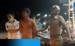 Tidak lama kemudian, dua anggota polis dilihat mengawal seorang lelaki yang tidak berbaju dan berlumuran darah hingga ke kakinya keluar dari kedai runcit dalam keadaan bergari.