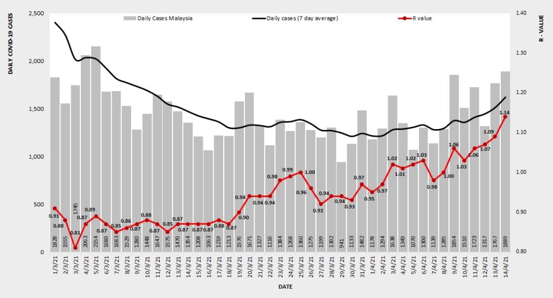 PETALING JAYA – Kadar kebolehjangkitan Covid-19 atau R-naught (R0) pada jangkaan mengikut kes seharian pada semalam untuk seluruh negara terus meningkat kepada 1.14.