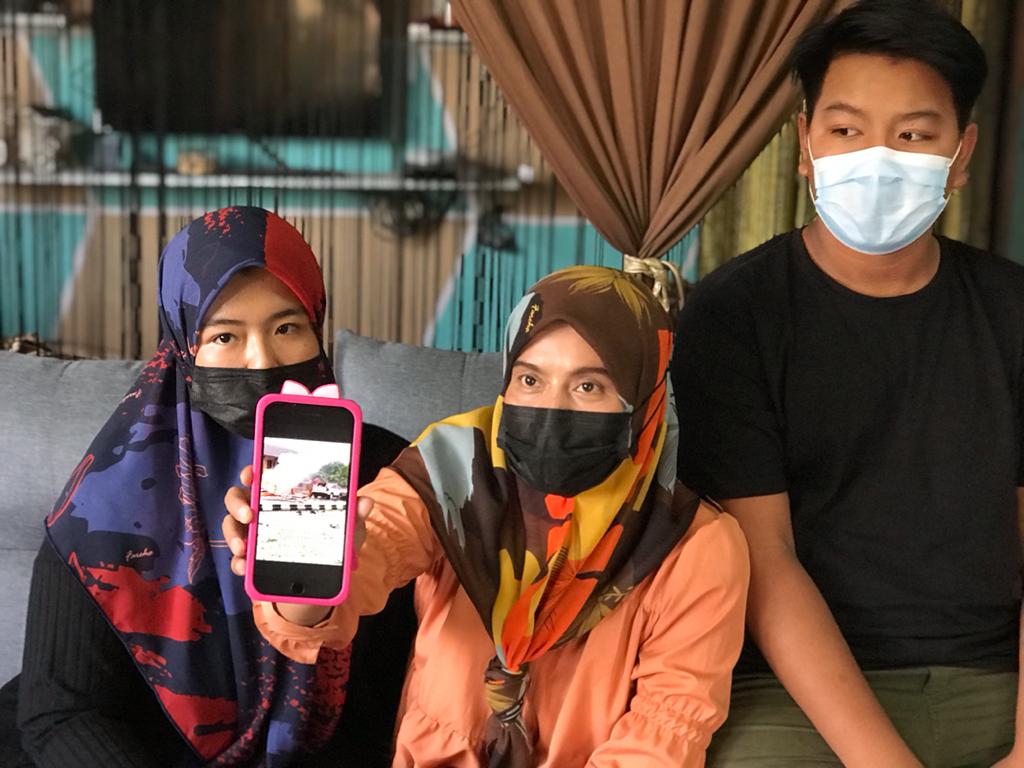 NOOR ASLINDA (tengah) menunjukkan gambar lokasi kejadian ketika ditemui di rumahnya di Kampung Kijang, Kota Bharu semalam.