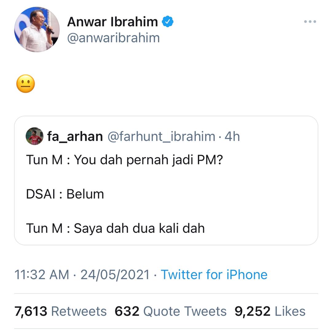 Terdahulu, seorang pengguna Twitter, @farhunt_ibrahim memuat naik satu ciapan dengan menulis pertanyaan bekas Perdana Menteri, Tun Dr. Mahathir Mohamad kepada Anwar.