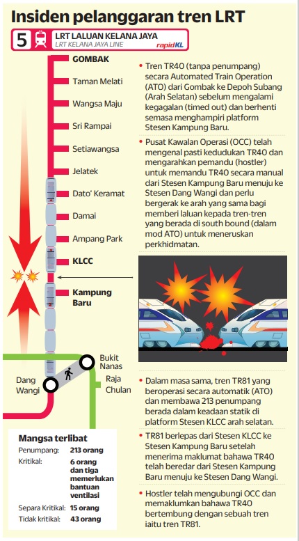 Itu suasana genting yang dialami 213 penumpang selepas dua tren Transit Aliran Ringan (LRT) Laluan Kelana Jaya bertembung sesama sendiri di laluan terowong bawah tanah antara Stesen KLCC dan Stesen Kampung Baru, kira-kira pukul 8.45 malam kelmarin.