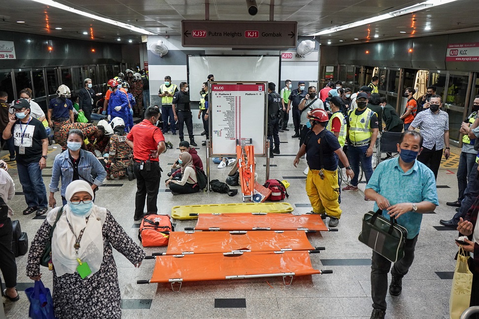 PASUKAN penyelamat membantu mangsa-mangsa kemalangan tren di Stesen KLCC malam kelmarin.