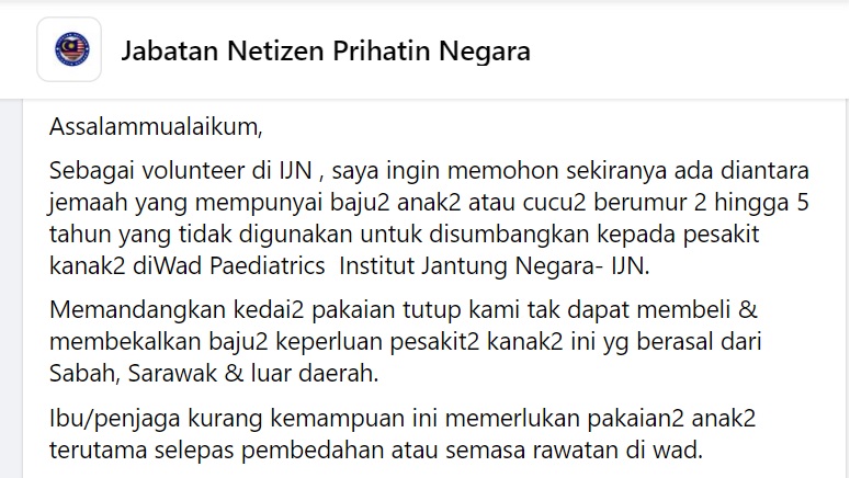 Terdahulu dalam mesej tersebut sukarelawan berkenaan meminta pakaian terutama yang mempunyai butang di bahagian hadapan untuk kanak-kanak berusia dua hingga lima tahun yang dirawat di wad kanak-kanak IJN.