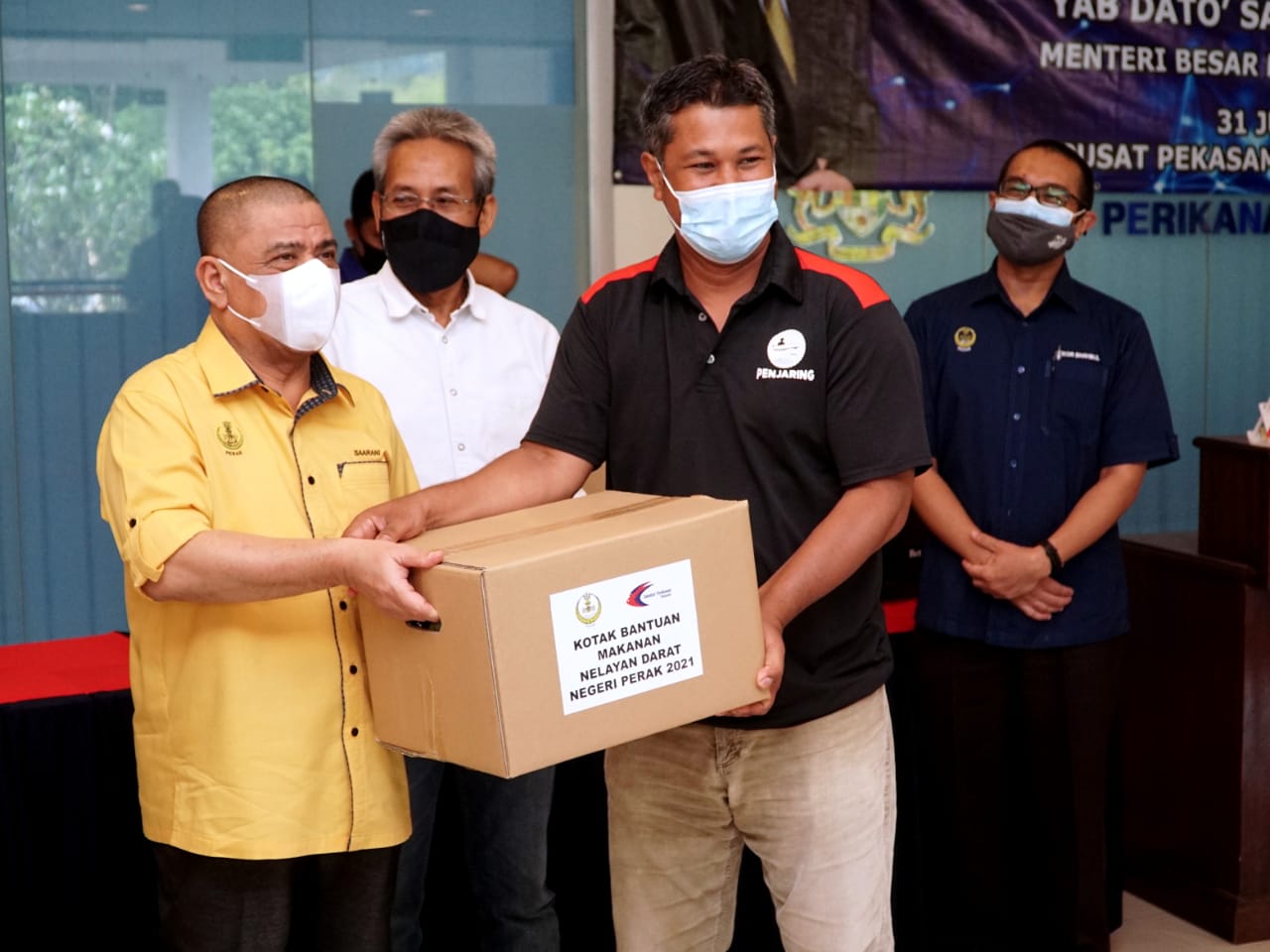 Saarani Mohamad (kiri) menyampaikan kotak bantuan makanan kepada nelayan darat pada program Penyerahan Bantuan Makanan Nelayan Darat Daerah Lenggong di Pusat Pekasam Negara, Lenggong hari ini. - Foto ZULFACHRI ZULKIFLI.