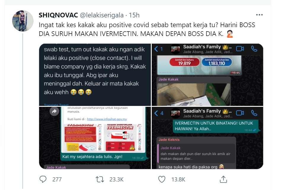 “Ingat tak kes kakak aku positif Covid-19 sebab kluster tempat kerja? Hari ini (semalam) bos dia suruh makan Ivermectin. Makan depan bos dia ya.