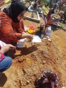 Isteri arwah memasukkan cebisan tanah kubur suaminya ke dalam bekas polisterin berisi makanan untuk dihantar ke petugas kesihatan. – Facebook