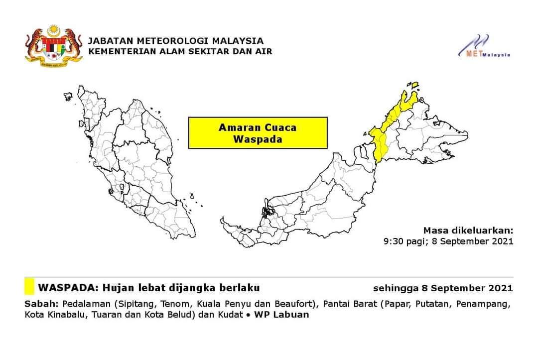 PETALING JAYA – Jabatan Meteorologi (MetMalaysia) mengeluarkan amaran cuaca waspada tahap kuning di beberapa kawasan di Sabah dan Wilayah Persekutuan Labuan hari ini.