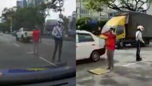 Tindakan anggota tersebut yang berdiri dibelakang lelaki itu sambil mengarahkan kereta-kereta di jalan raya supaya terus bergerak agar tidak menyebabkan kesesakan lalu lintas.