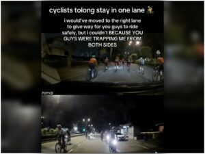 PETALING JAYA – Seorang penunggang basikal nyaris dilanggar sebuah kereta akibat menukar lorong paling kanan ke kiri jalan secara tiba-tiba dalam keadaan gelap.