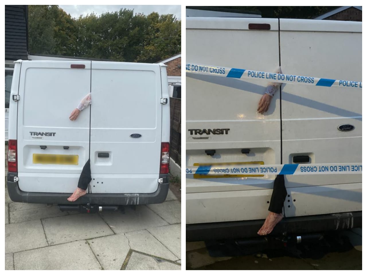 Daren Houlker, 49, menghias van miliknya dengan tangan dan kaki manusia yang diperbuat daripada plastik serta menggantungnya di bahagian belakang kenderaan itu.