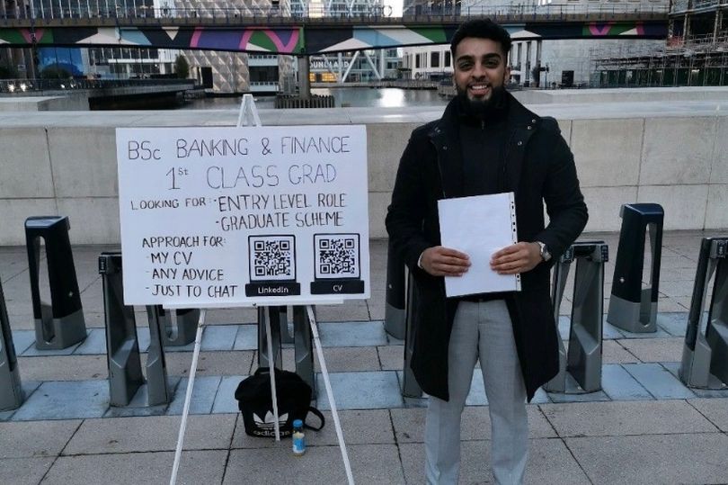 Dia kemudian membeli papan dari kedai alat tulis di Romford dan melekatkan kod QR padanya supaya orang ramai boleh melihat profil CV dan LinkedIn miliknya dengan mudah.