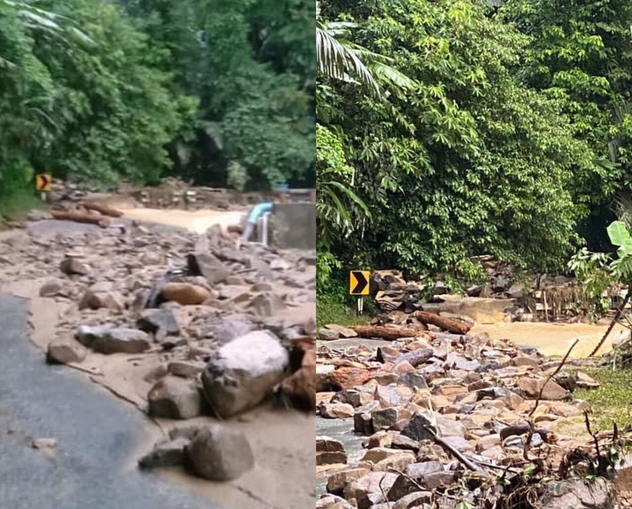 Menerusi video yang dikongsi Khabar Bentong di laman Facebook, laluan berkenaan terhalang untuk kegunaan kenderaan disebabkan lumpur selain dipenuhi batu bersaiz besar di atas jalan.