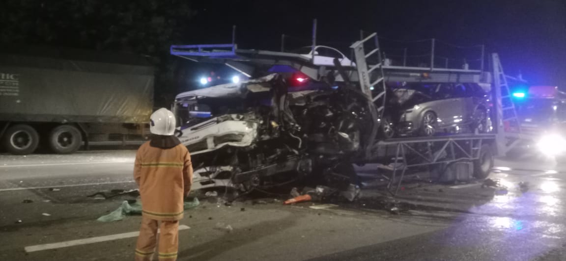 “Siasatan awal mendapati, pemandu lori yang membawa kereta jenis Volvo berkenaan telah merempuh sebuah treler menyebabkan sebuah daripada tiga kereta telah tercampak keluar.