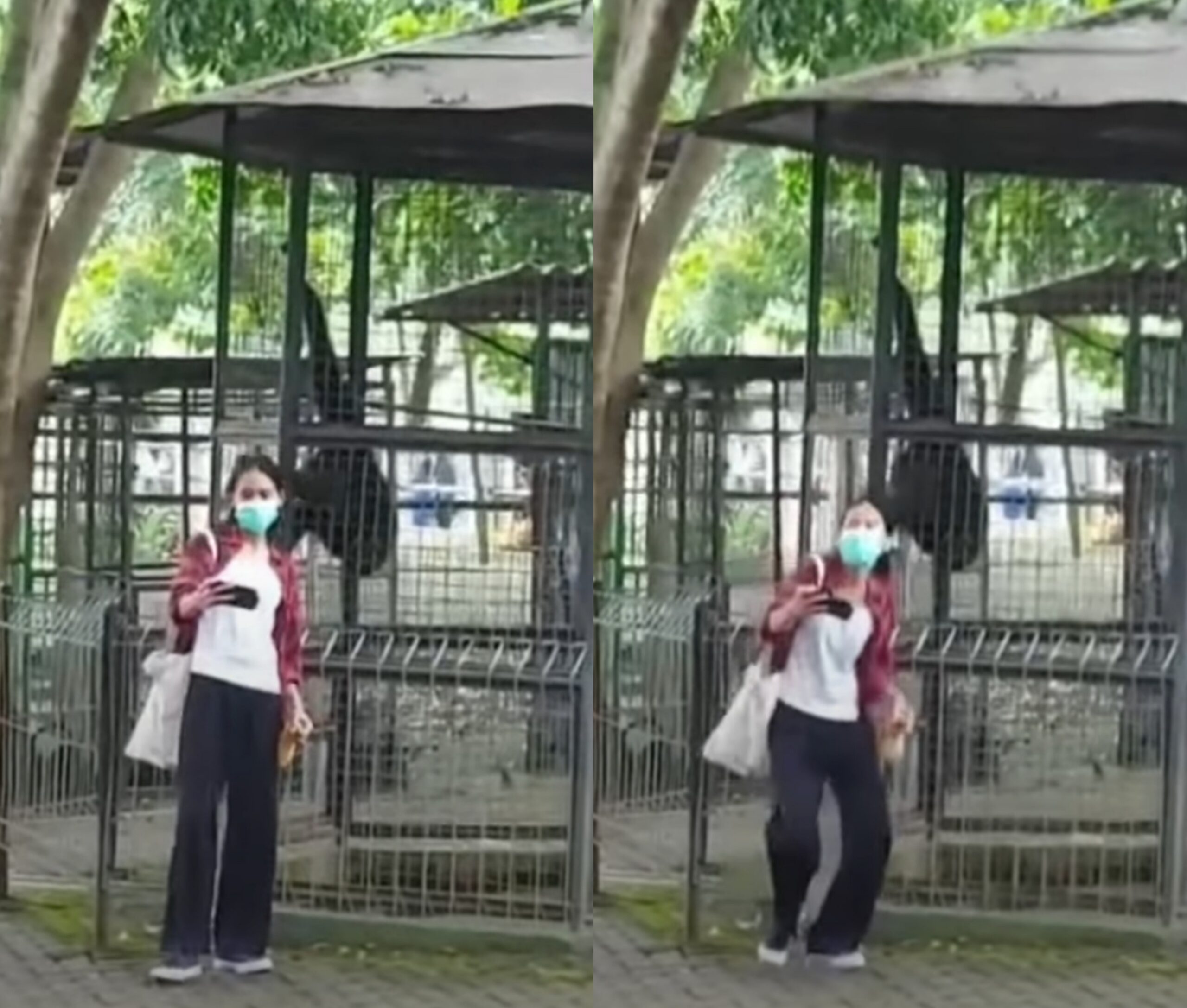 Wanita itu berdiri di hadapan kurungan itu lalu mengangkat telefonnya untuk berswafoto.