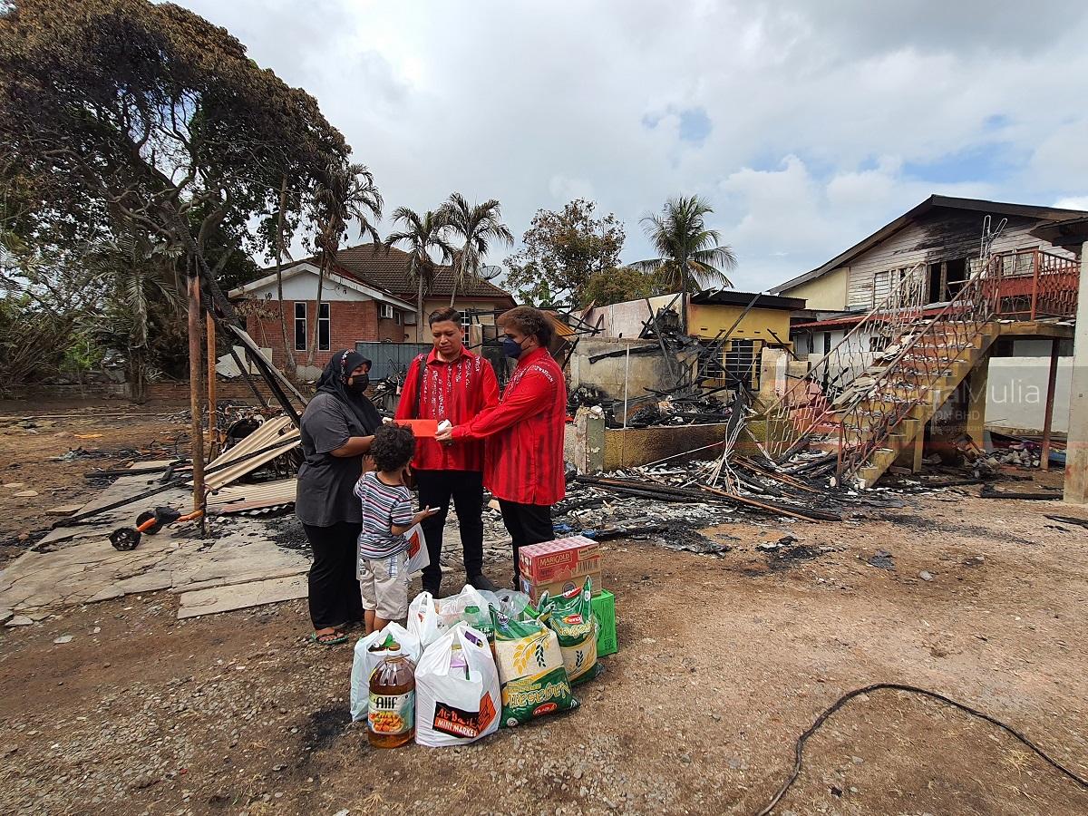 MOHAMMAD SHEIKH (kanan) menyampaikan sumbangan barangan keperluan dan wang tunai kepada mangsa kebakaran, Siti Katijah di rumah sewanya di Alor Setar semalam.