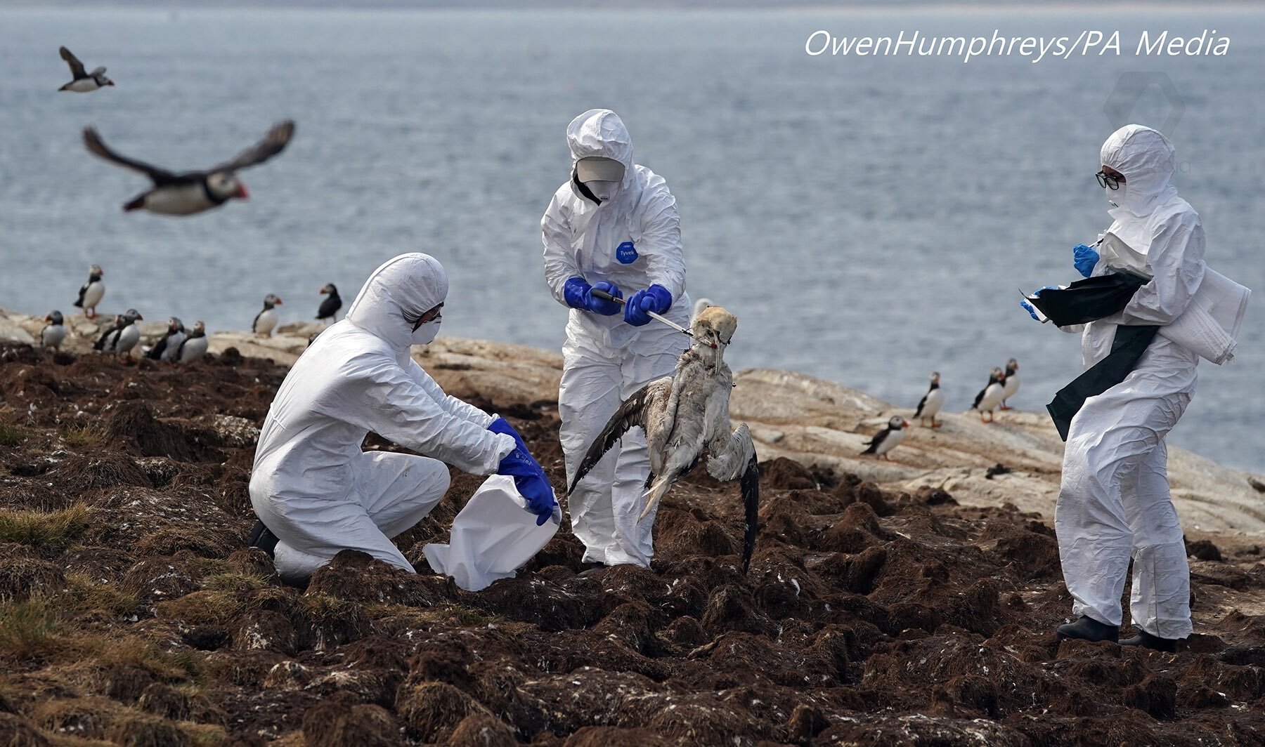Anggota-anggota renjer terpaksa memakai sut pelindung diri untuk mengutip bangkai burung dijangkiti. Setakat ini, lebih 3,000 bangkai telah dikutip untuk dibakar.