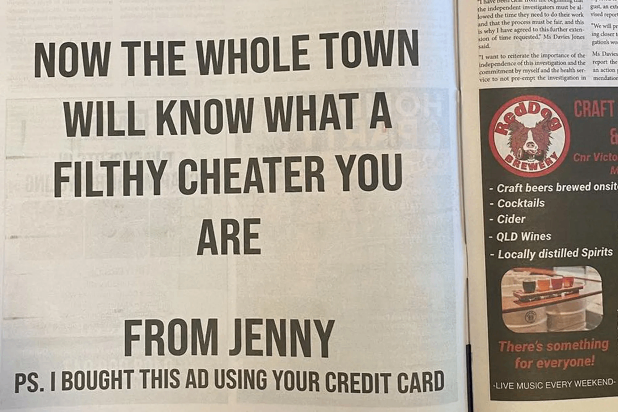 “Sekarang seluruh bandar akan tahu kamu seorang lelaki curang. Daripada Jenny. P.S. Saya beli iklan ini menggunakan kad kredit anda,” demikian maksud kata-kata pada iklan tersebut.