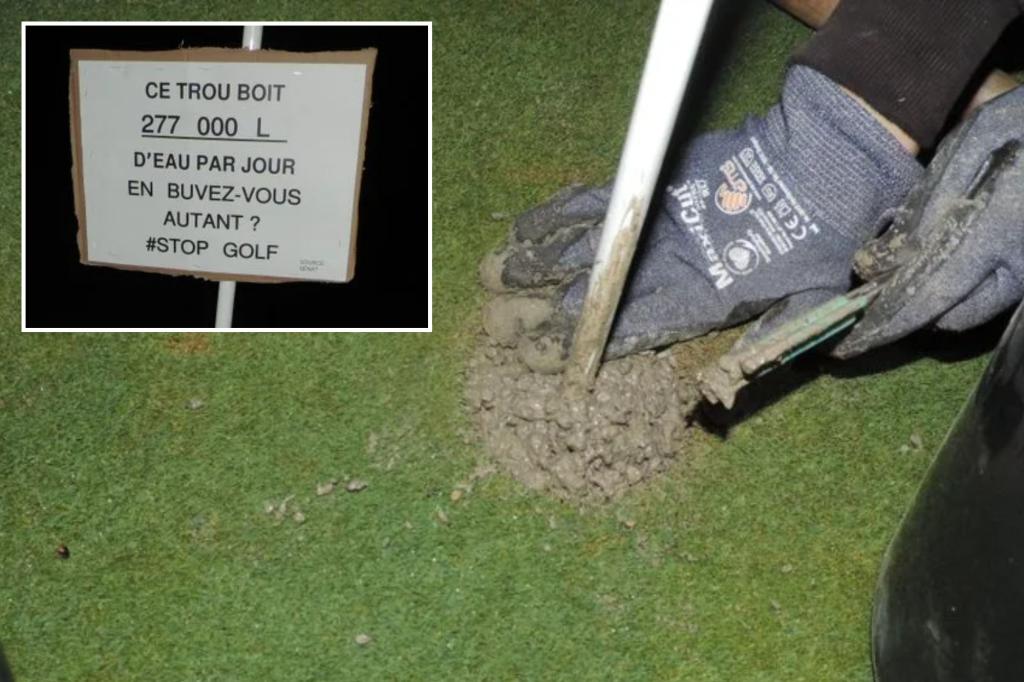 Extinction Rebellion menyiarkan gambar di laman Twitter menunjukkan lubang-lubang golf diletakkan simen dan papan tanda bertulis ‘Lubang ini ‘meminum’ 277,000 liter air. Adakah anda minum sebanyak itu? #Hentikan Golf’.