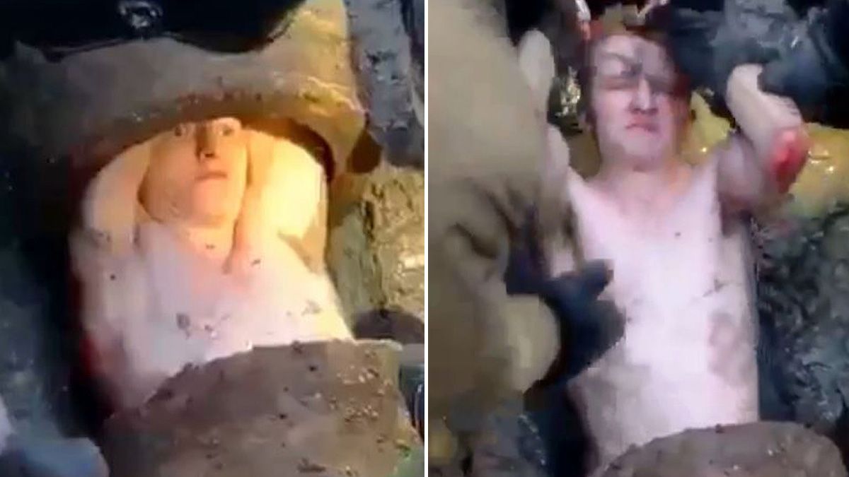 Anggota penyelamat terpaksa mengambil masa selama tujuh jam untuk mengeluarkan Evgeny Titov, 21, dari paip pembetung itu di sebuah tempat letak kereta di Lapangan Terbang Pulkovo, Saint Petersburg.