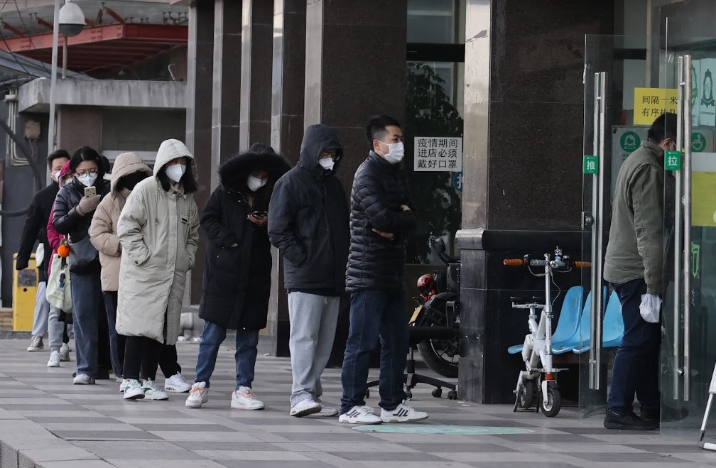 Orang ramai beratur untuk membeli kit ujian saringan Covid-19 di sebuah farmasi di Xi'an pada 20 Disember 2022. - AFP