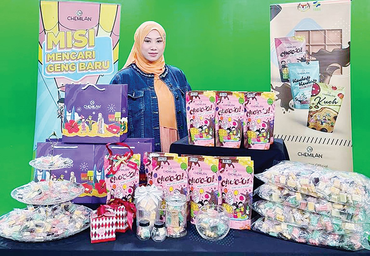NASYRAH menunjukkan sebahagian produk makanan di bawah jenama Chemilan.