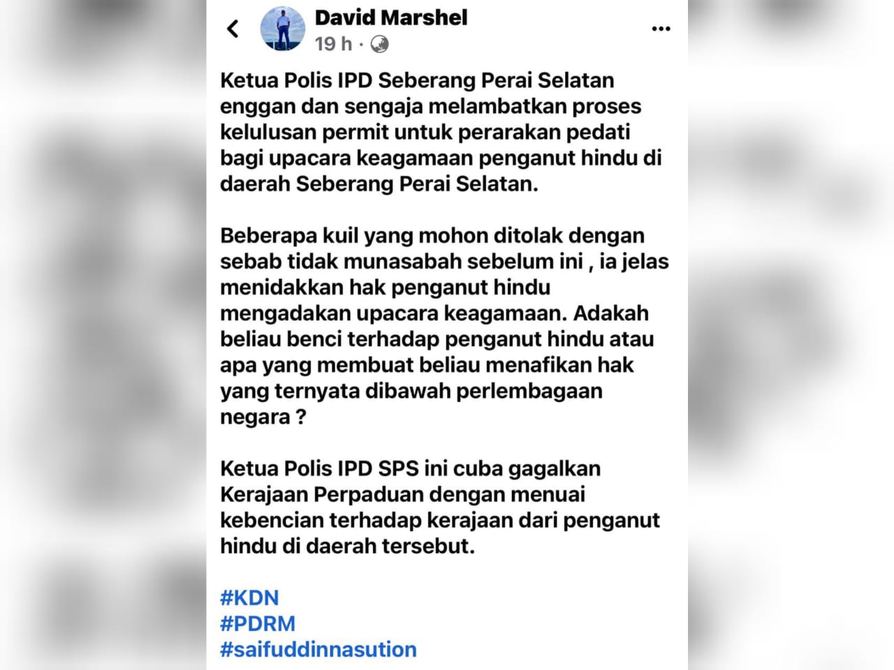 SEBERANG PERAI – Ketua Polis Daerah Seberang Perai Selatan (SPS) membuat laporan polis terhadap pemilik akaun Facebook, David Marshel yang merupakan Ahli Majlis Bandaraya Seberang Perai (MBSP) selepas didakwa mengeluarkan kenyataan berunsur fitnah.