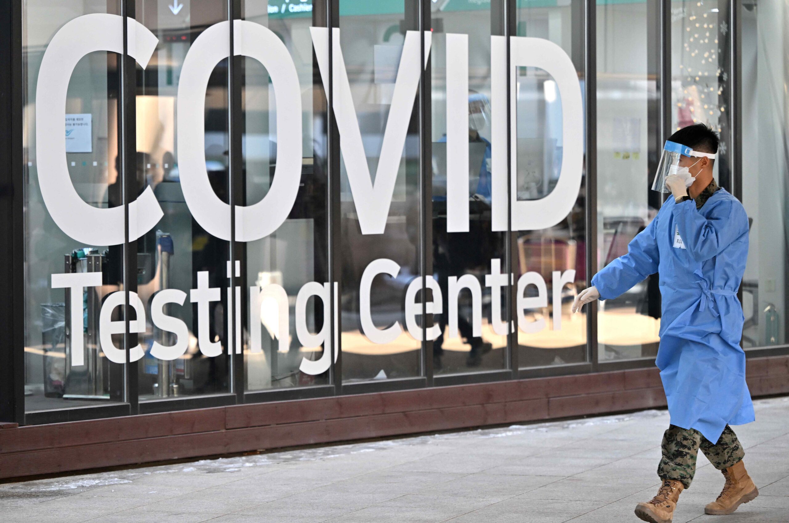 Seorang pekerja kesihatan berjalan di hadapan pusat ujian Covid-19 di Lapangan Terbang Antarabangsa Incheon, barat Seoul pada 3 Januari lalu. - AFP