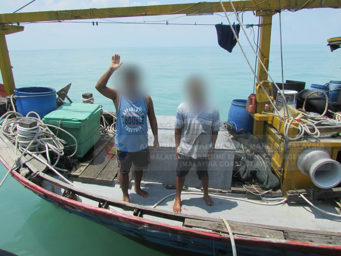 PARIT BUNTAR – Agensi Penguatkuasaan Maritim Malaysia (APMM) Zon Maritim Kuala Kurau menahan sebuah bot nelayan tempatan kelas B bersama dua nelayan warga Myanmar di kedudukan 8.8 batu nautika barat laut Pulau Pasir Hitam dekat sini kira-kira pukul 1.15 petang semalam.