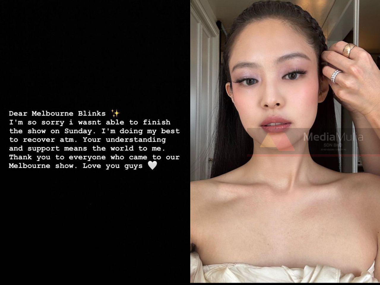 Menerusi akaun Instagram milik Jennie, dia membuat satu hantaran permohonan maaf kerana meninggalkan pentas secara tiba-tiba, atas faktor kesihatan.