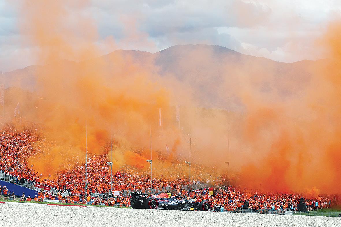 SUASANA litar berubah warna jingga kemerahan sebaik sahaja Verstappen menjuarai GP Austria di Litar Red Bull Ring semalam. – FB ORACLE RED BULL RACING