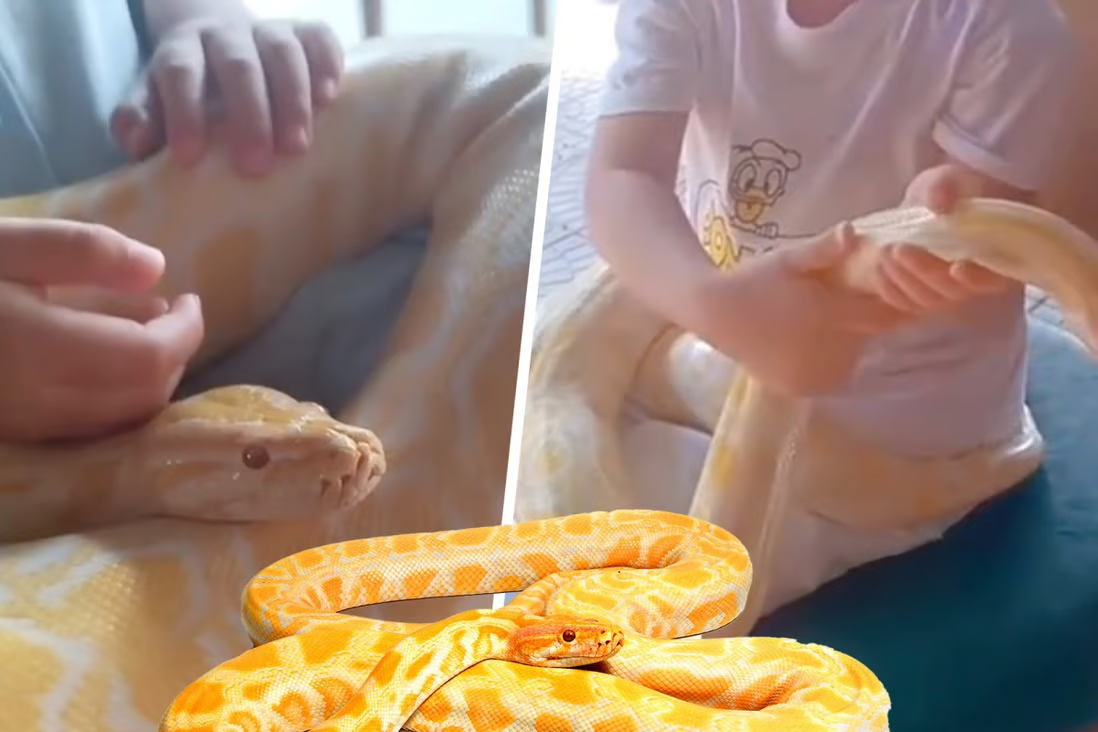 Dalam video tersebut, budak perempuan itu tertidur sambil bersandar pada kerusi ketika ular sawa besar itu melilit pinggangnya. Dia kemudian terjaga dan bermain dengannya.