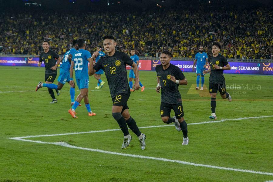 ARIF AIMAN (depan) meraikan gol kedua Malaysia pada aksi Pestabola Merdeka 2023 yang menyaksikan Malaysia menang 4-2 ke atas India di Stadium Nasional Bukit Jalil sebentar tadi. GAMBAR: FARIZ RUSADIO