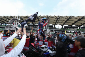 PELUMBA negara, Nazirul Izzat Bahauddin menoktahkan kemenangan pertamanya di pentas Asia selepas menjuarai perlumbaan Underbone (UB) 150cc pada perlumbaan penutup tirai Kejuaraan Motosikal Asia (ARRC) 2023 di Litar Antarabangsa Chang, Buriram hujung sebentar tadi.