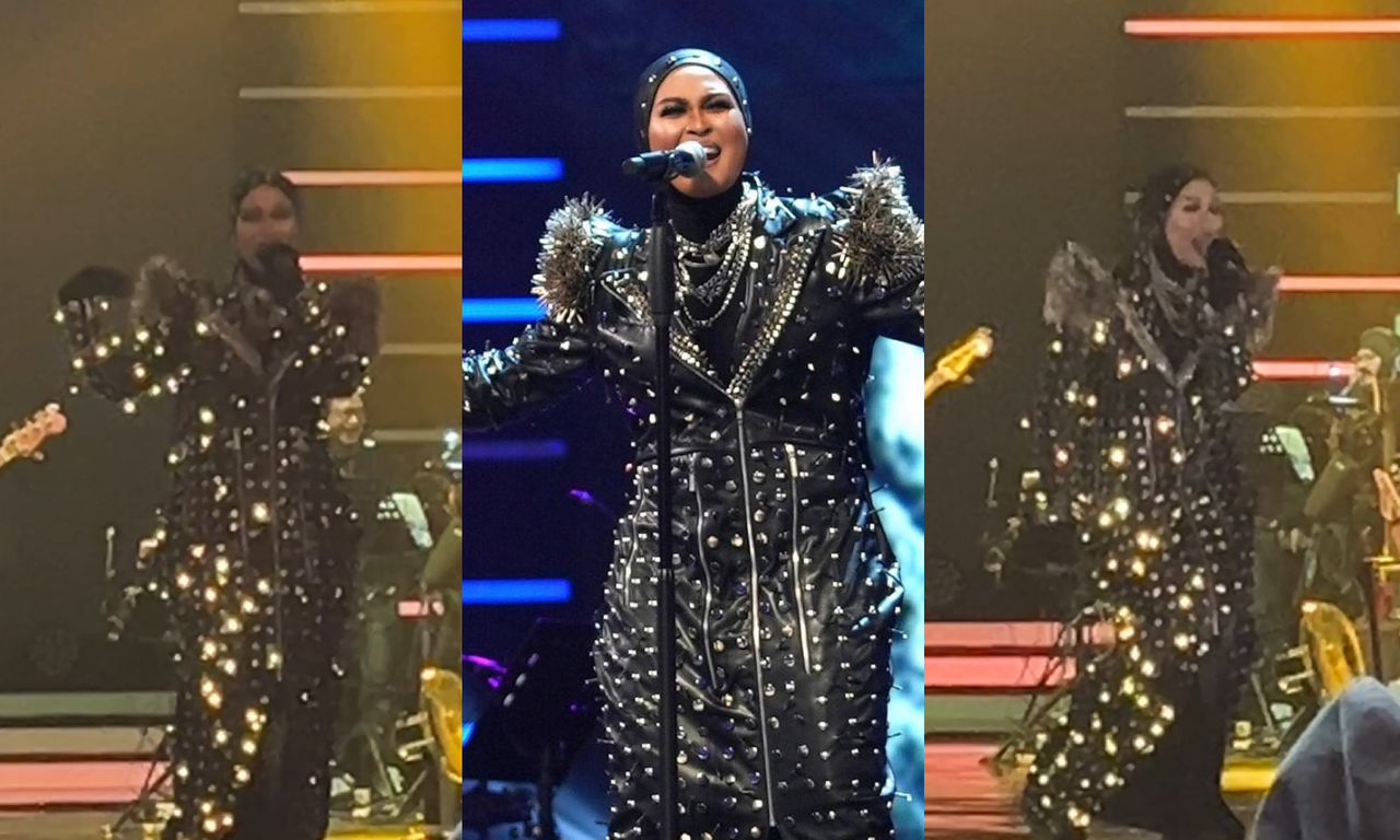 Menerusi persembahannya, Nana memakai dres labuh material kulit yang dipenuhi dengan hiasan paku berwarna silver.