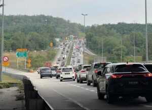 Wanita tersebut dilihat berdiri di tepi jalan raya sambil menunjukkan sepanduk kepada penunggang motosikal dan pemandu kenderaan yang lalu-lalang.