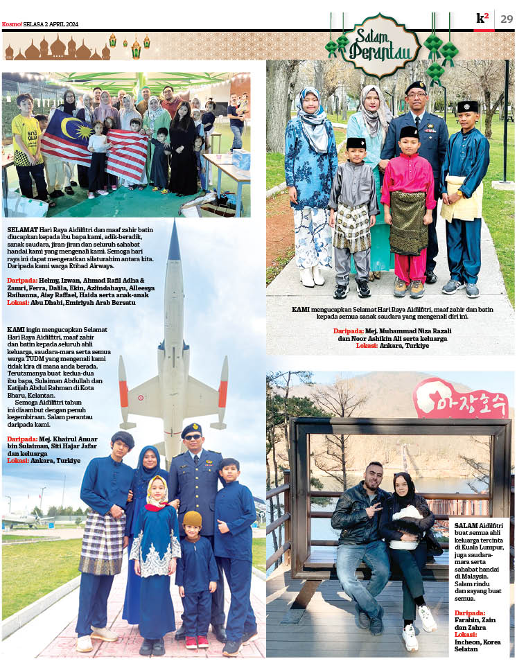Kami ingin mengucapkan Selamat Hari Raya Aidilfitri, maaf zahir dan batin kepada seluruh ahli keluarga, saudara-mara serta semua warga TUDM yang mengenali kami tidak kira di mana anda berada. Terutamanya buat kedua-dua ibu bapa, Sulaiman Abdullah dan Katijah Abdul Rahman di Kota Bharu, Kelantan.