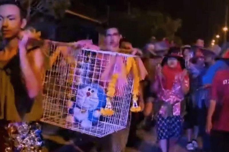 Upacara itu menyaksikan penduduk daerah Phayuha Khiri, wilayah Nakhon Sawan, mengarak patung Doraemon yang diletakkan di dalam sebuah sangkar sambil merenjiskan air.