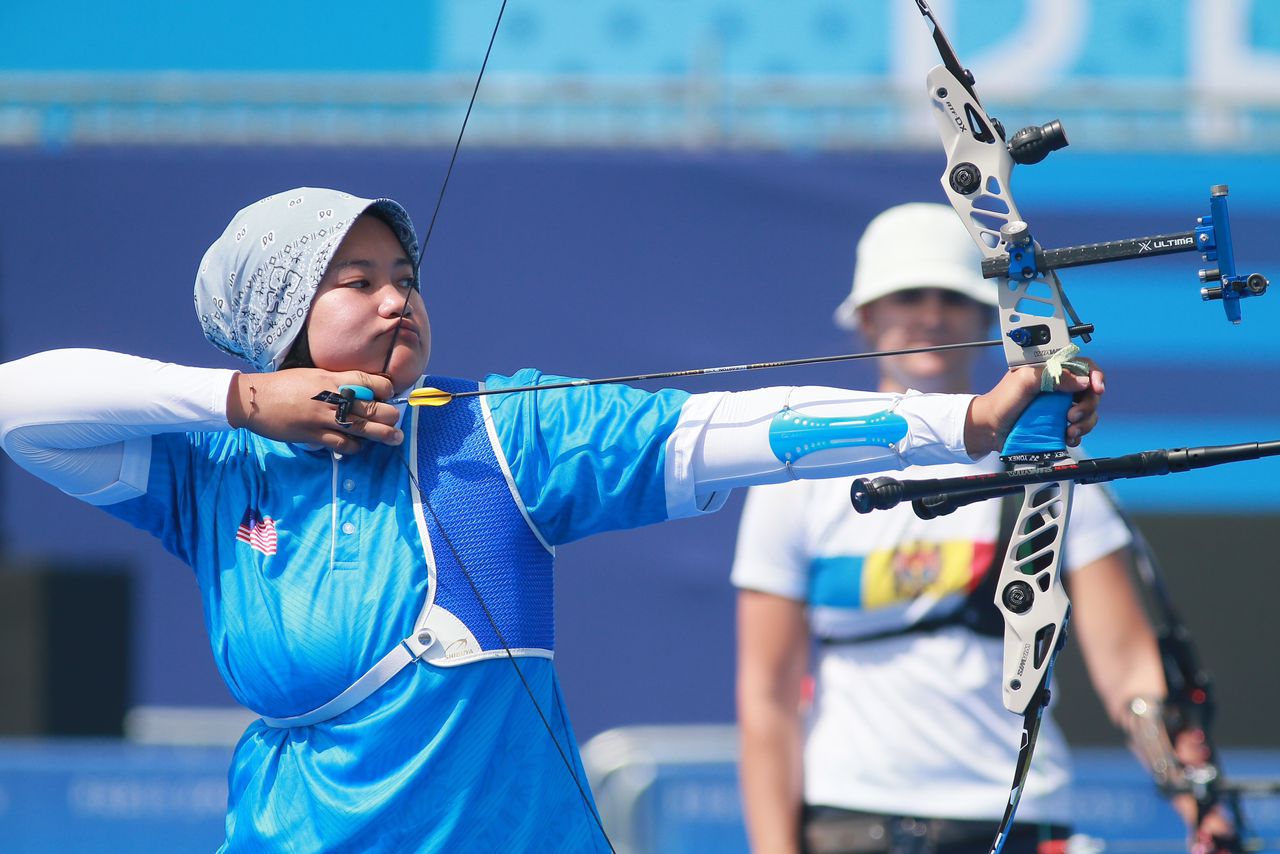 SYAQIERA terlepas tiket kepusingan 1/8 terbaik selepas tewas kepada pemanah Brazil, Ana Luiza Sliachticas Caetano. Foto: Majlis Olimpik Malaysia (MOM)